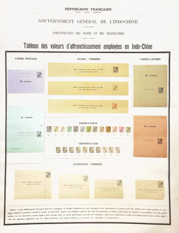 Affiche comprenant les timbres postes et entiers postaux surchargés 'Spécimen'