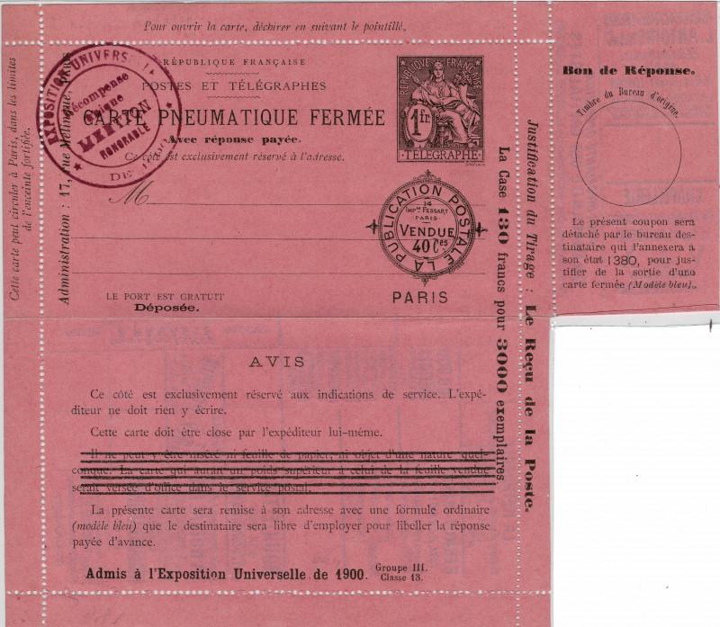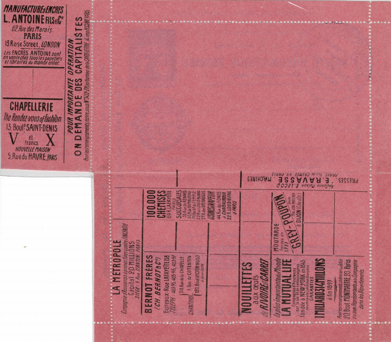 Carte-lettre pneumatique de Paris avec annonces à l'intérieur. Edition "La Publication Postale" 14, impasse Fessart, Paris. Nouveau prix de vente 40 c. en surcharge au recto.