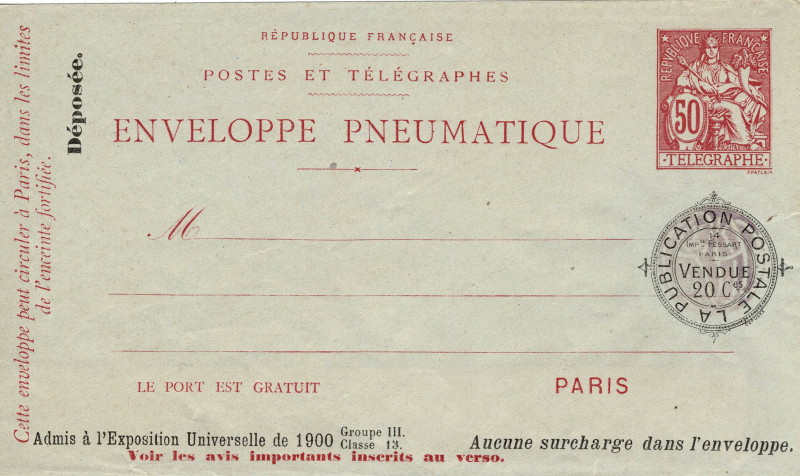 Recto, mention ‘Vendue 20 c.’ dans un cercle et textes ‘Déposé’ et ‘Admis à l'Exposition universelle de 1900, groupe III, classe 13’.