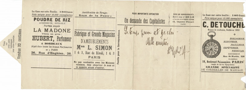 Annonces éditées par ‘La Publication Postale’, 14, impasse Fessart, Paris.