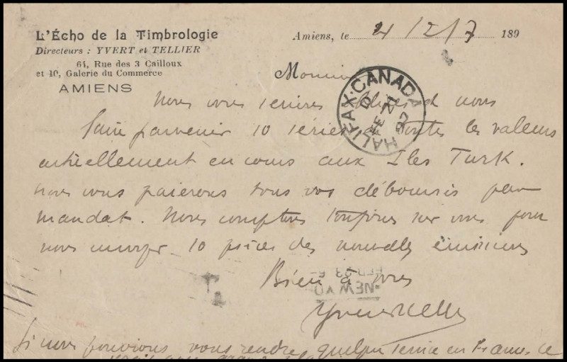 Entier 10c Sage oblitéré d’Amiens (4 février 1897) à destination de Turks Islands (10 mars) avec transit via Halifax Canada le 21 février. Marque FE 8 – 18 – 97.