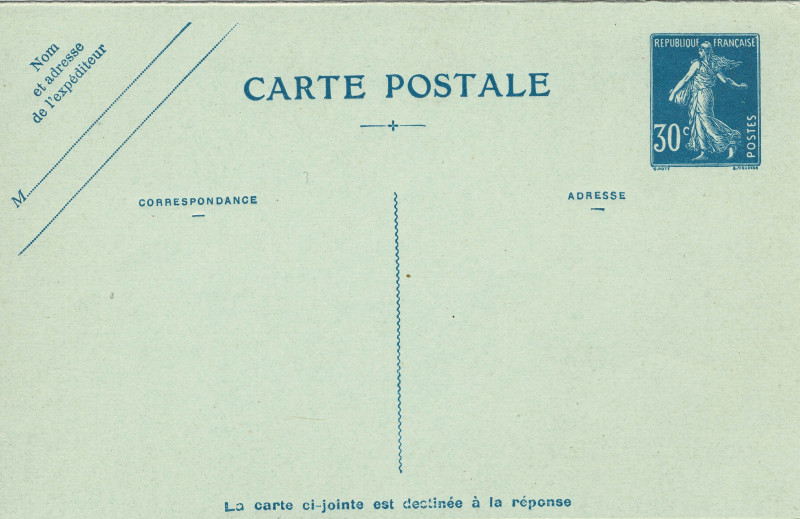Carte postale au type semeuse camée avec réponse payée 30 c. + 30 c. bleu sur carton bleu clair (Erreur de couleur du carton). Tarif du 1er mai 1926.