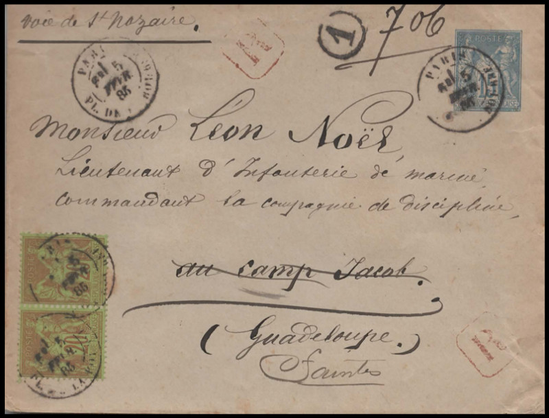Entier 15c Sage (147x112mm) avec TaD Paris, Pl de la Bourse du 5 février 1885 avec recommandation de 40c pour un militaire du Camp Jacob puis réexpédié aux Saintes. Voie maritime de Saint-Nazaire.