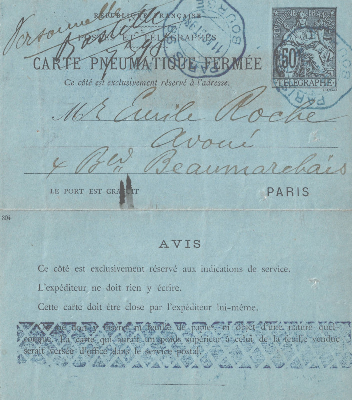 Carte pneumatique fermée - Date 804 - Avec les 3 dernières lignes du verso annulées par des losanges