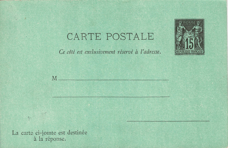 Carte postale avec réponse payée ; type ‘Sage’. Légende : ‘Ce côté est exclusivement réservé à l'adresse’ ; 3 lignes pour l'adresse ; 1 exemplaire connu.